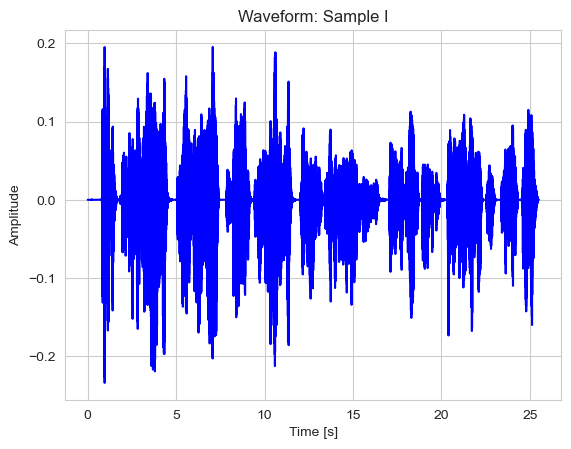 plot_waveform(signal=sample, sr=SR, title="Waveform: Sample I", save_to="assets/images/2_1_waveform_sample_I.png")