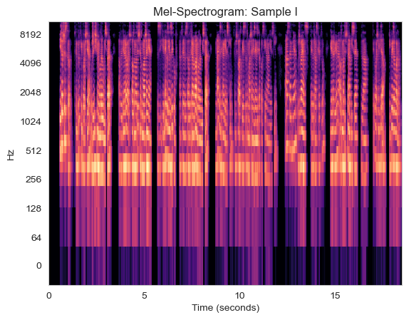 get_mel_spectrogram(audio_signal=sample, sampling_rate=SR, title="Mel-Spectrogram: Sample I", save_to="assets/images/2_3_mel_spectrogram1_sample_I.png")